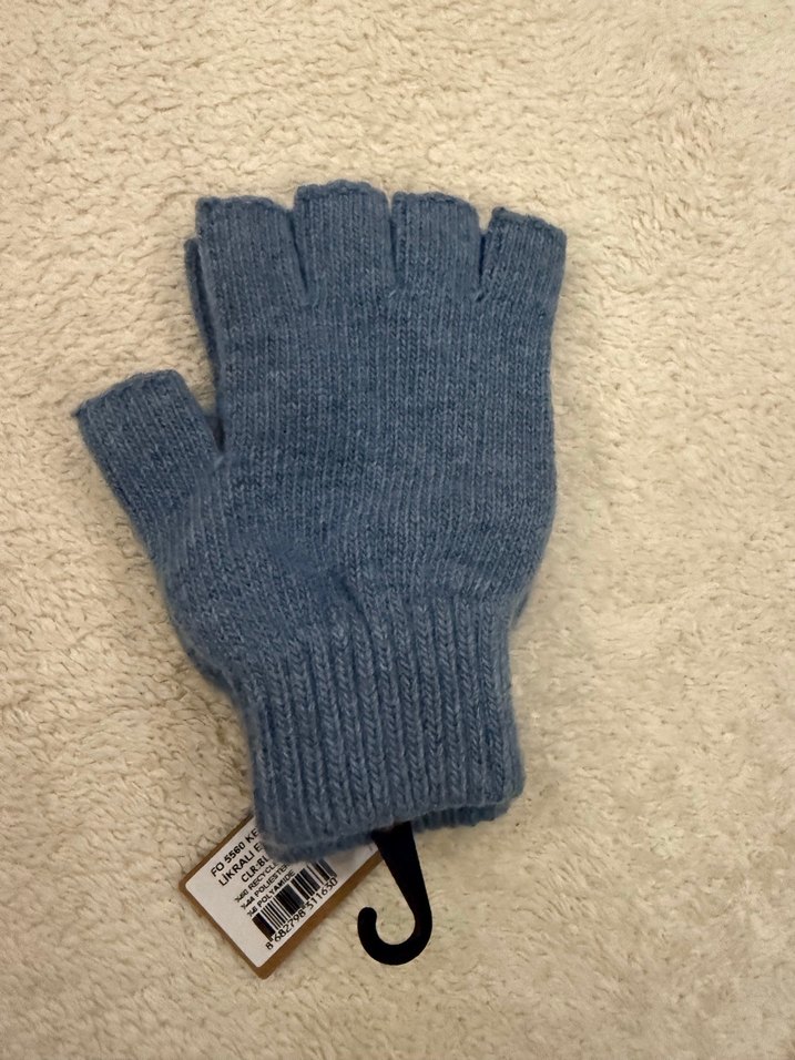 Mavi ve gri renklerde örgü yün yarım parmak eldiven, rahat ve sade kullanıma uygundur.