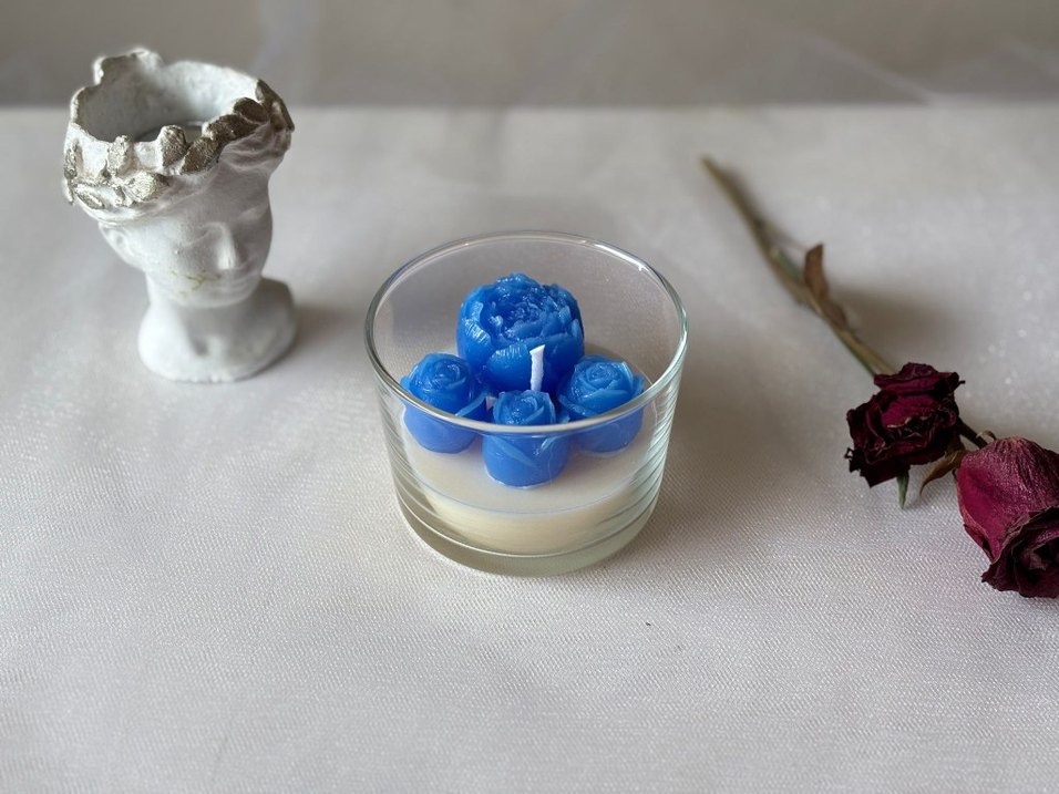 Şeffaf cam mumluk içinde açık mavi gül şekilli mum seti, sıcak bir ortam yaratmak için ideal.