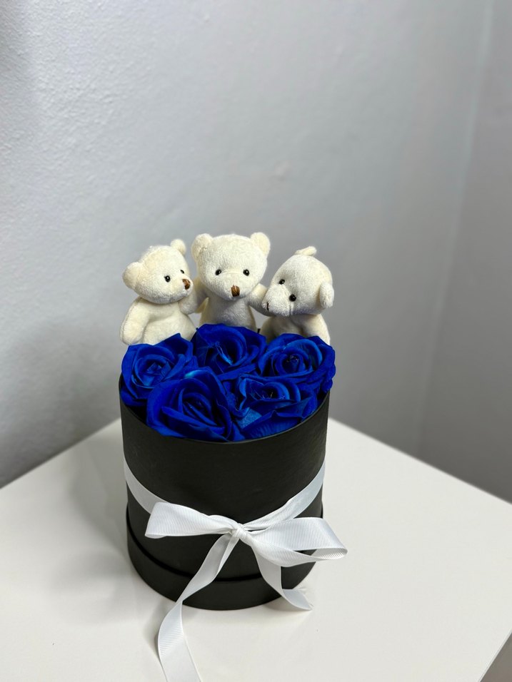 Siyah yuvarlak kutuda beyaz kurdele ile bağlanmış koyu mavi güller ve üç küçük beyaz ayıcık yer alıyor.