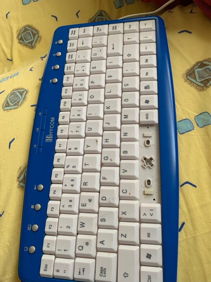 Bu hafif mavi klavye, beyaz tuşlar ve yan tarafta kolay erişim için ek fonksiyon tuşları içerir. Bir tuş kapağı eksik
