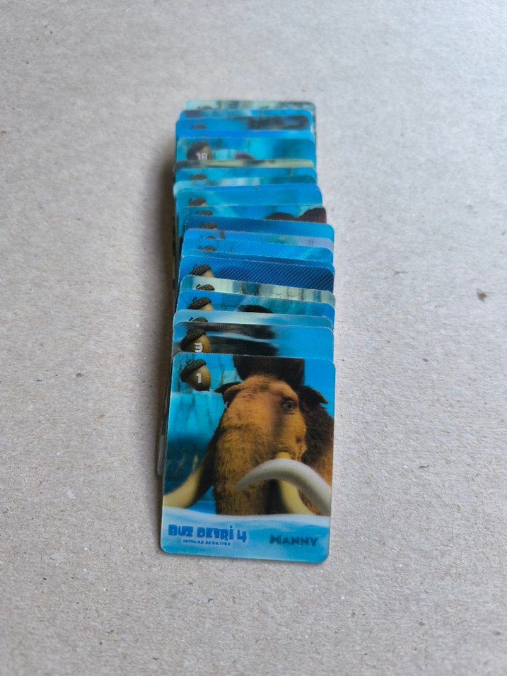 Mavi renkli, Manny figürlü Buz Devri 4 temalı hafıza kartları. Koleksiyon veya oyun için uygundur.