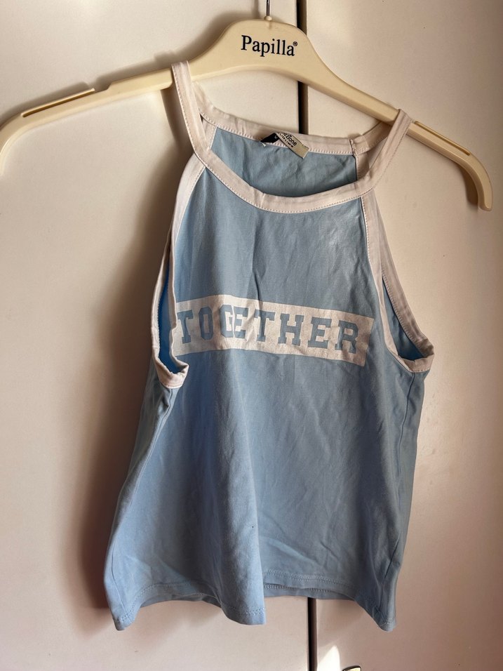 Mavi renkte, halter yaka ve kısa kesim, fitted tasarıma sahip pamuklu mini atlet. "TOGETHER" baskılı ve örme dokulu, günlük rahat stil için uygundur.