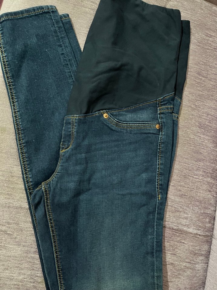 Mavi, kot kumaştan, konforlu esnek panel ile günlük kullanım için uygun, dar kesim hamile pantolonu.