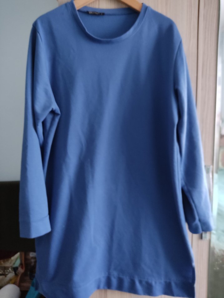 Mavi renkte, yuvarlak yakalı ve uzun kollu hamile midi tunik. Yumuşak ve sıcak kumaştan, salaş kesimli, minimal ve günlük kullanıma uygun.