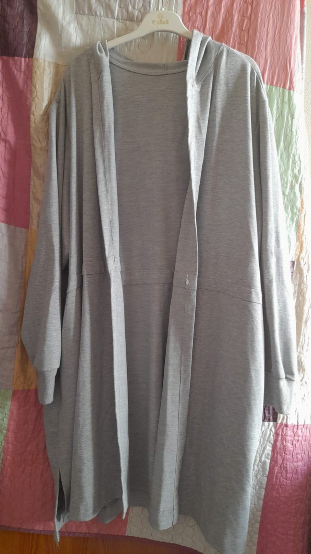 Yumuşak sentetik kumaştan, spor ve günlük kullanım için uygun, normal boyda ve vücuda oturan sabahlık