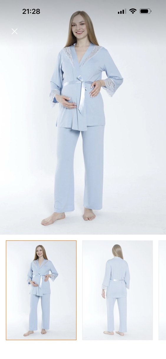 Pastel mavi renkte, notched lapel yakalı, uzun kollu, midi boy ve regular fit hamile ve emzirme pijama takımı. Konforlu yumuşak kumaş ve bağcıklı bel bulunur.