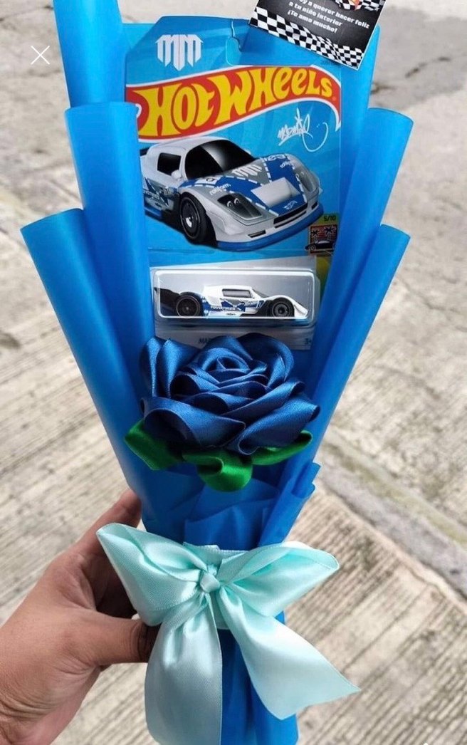 Mavi yapay gül ve Hot Wheels oyuncak arabadan oluşan renkli hediye buketi, mavi kağıt ve saten kurdele ile sarılmıştır istenilen renkte sipariş ile yapılır