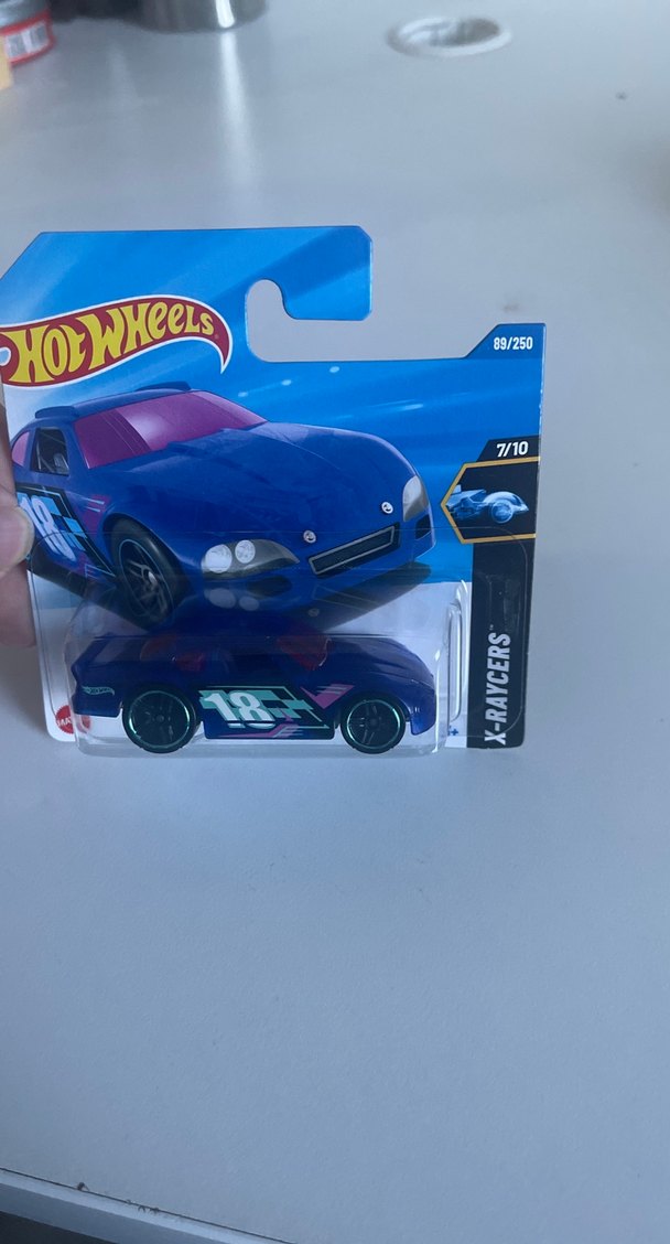 Koyu mavi Hot Wheels oyuncak araba, 250 adet içinden 89 numara, sportif tasarım ve 18 numaralı desenlere sahip. X-Racers serisinden.