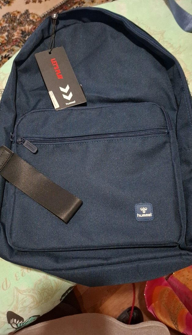 Hummel markalı, koyu mavi renkli erkek sırt çantası, fermuarlı ön cep ve baskılı detaylara sahip, günlük rahat kullanım için uygundur.
