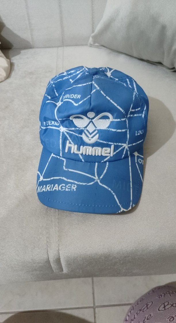 Renkli grafik desenli, logo işlemeli mavi Hummel spor şapka. Günlük kullanıma uygun, trend ve rahat stil sunar.