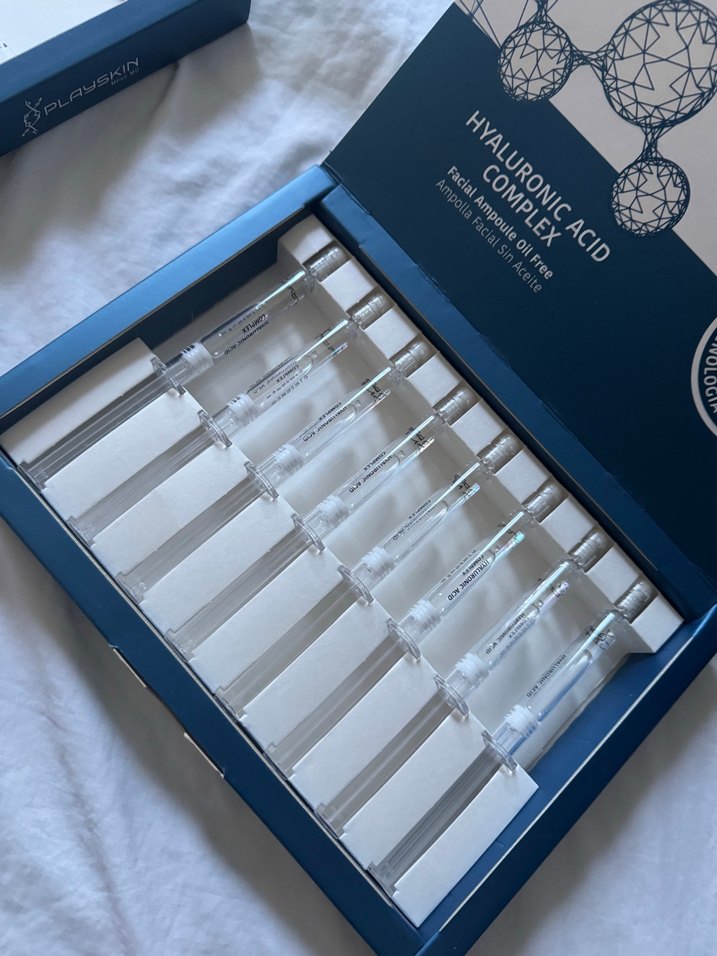 Mavi kutuda Hyaluronik Asit Kompleksi içeren yüz ampul seti bulunur, cildi nemlendirir ve canlandırır. Kutuda 'HYALI' yazısı mevcuttur.
