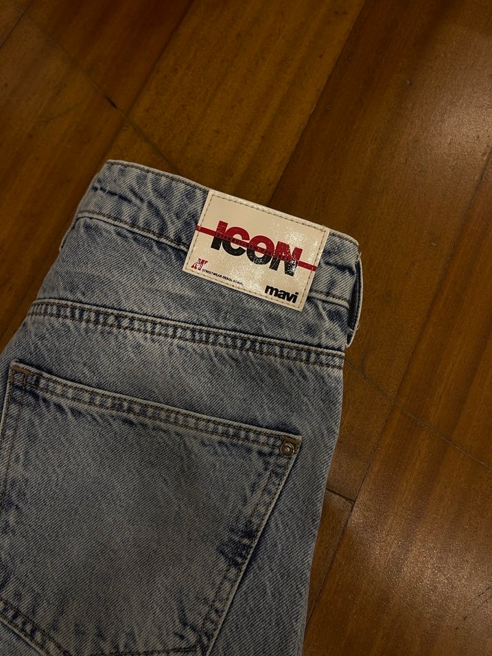 Mavi kot pantolon, loose fit ve mini boyda, baskılı detaylara sahip. Düğmeli ve ICON markalı, rahat sokak stili kot.