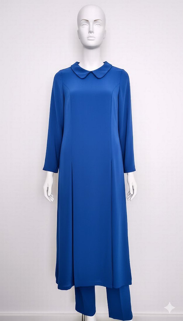 Mavi ikili takım, yakalı Drapeli tasarımı ve görünümüyle ofis ve özel günler için şık ve sade bir seçenektir.