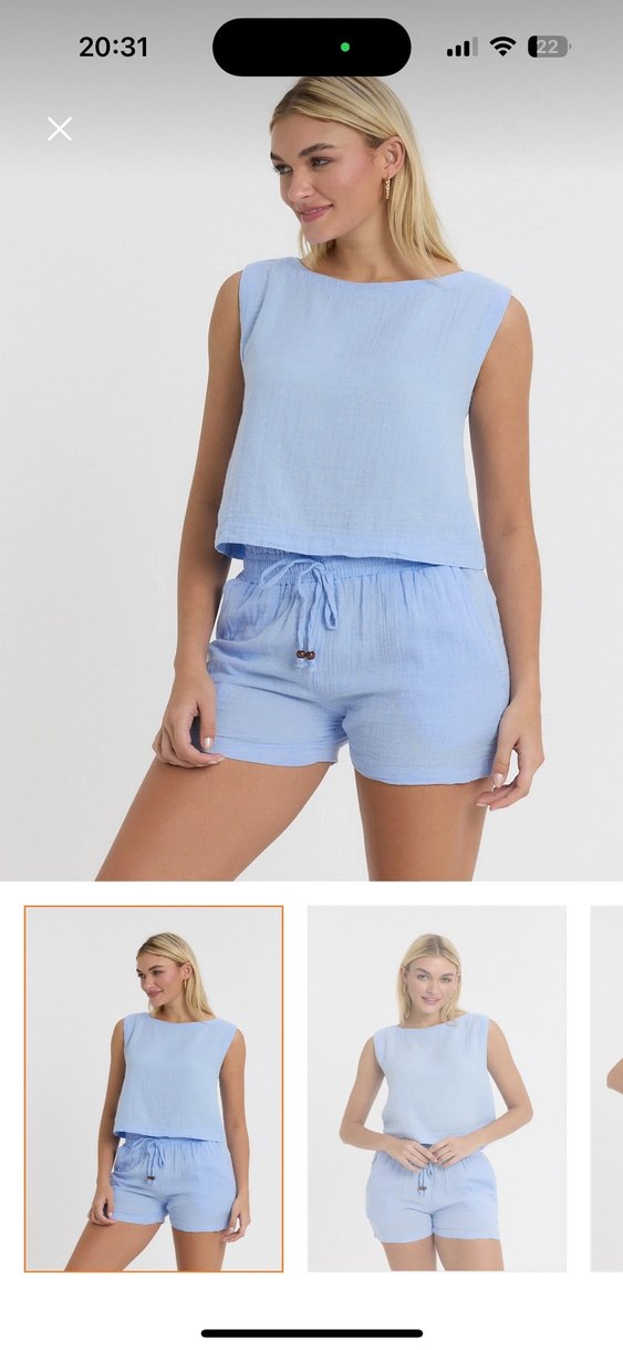 Pamuk kumaştan, salaş kesim, kolsuz mavi mini tulum. Yuvarlak yaka ve bağcıklı bel detayıyla rahat ve şık. Günlük kullanım için uygun.
