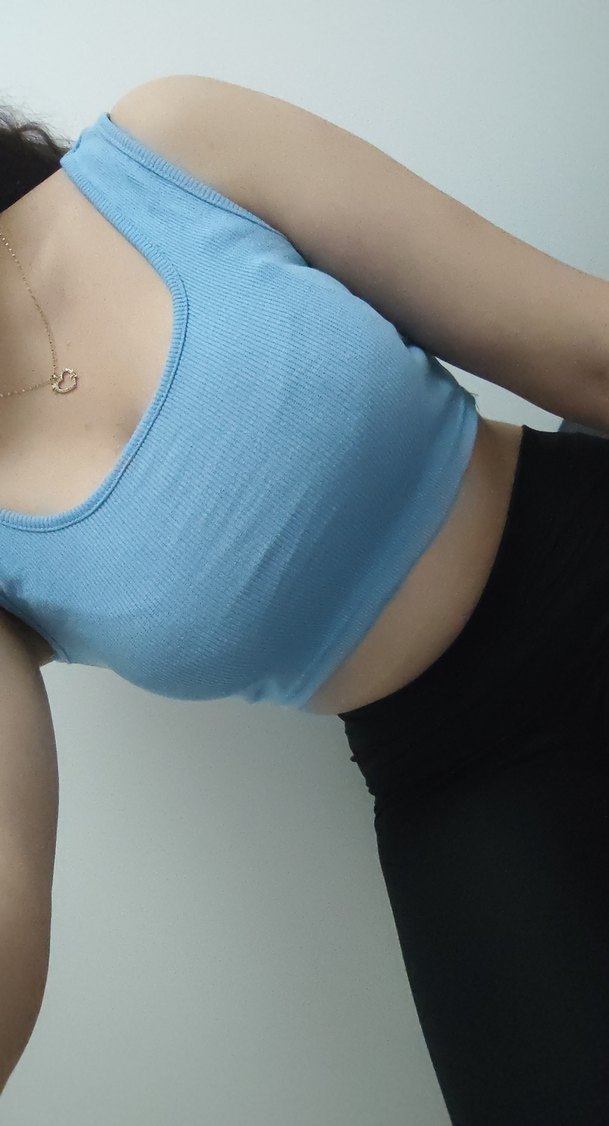 Mavi, düz kesim, ince askılı ve vücuda oturan atlet. İpeksi kumaştan üretilmiş, günlük kullanıma uygun midi boyda rahat bir parça.