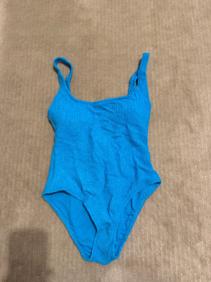 Mavi renkli, ince askılı ve vücuda oturan kadın mayosu. Düz ve desen içermeyen tasarımıyla plajda şık ve sade bir görünüm sunar.