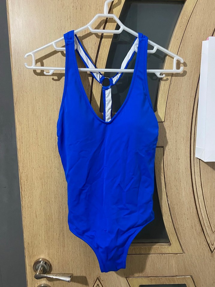 İnce askılı, midi boy, fitted mavi kadın mayo. Hiç giyilmedi gogus kismi bana acik geldi.