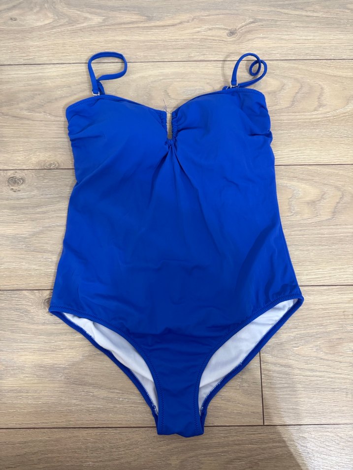 Mavi renkli, ince askılı ve vücuda oturan kadın mayosu, çağdaş ve minimal tarzda, plaj için uygundur.