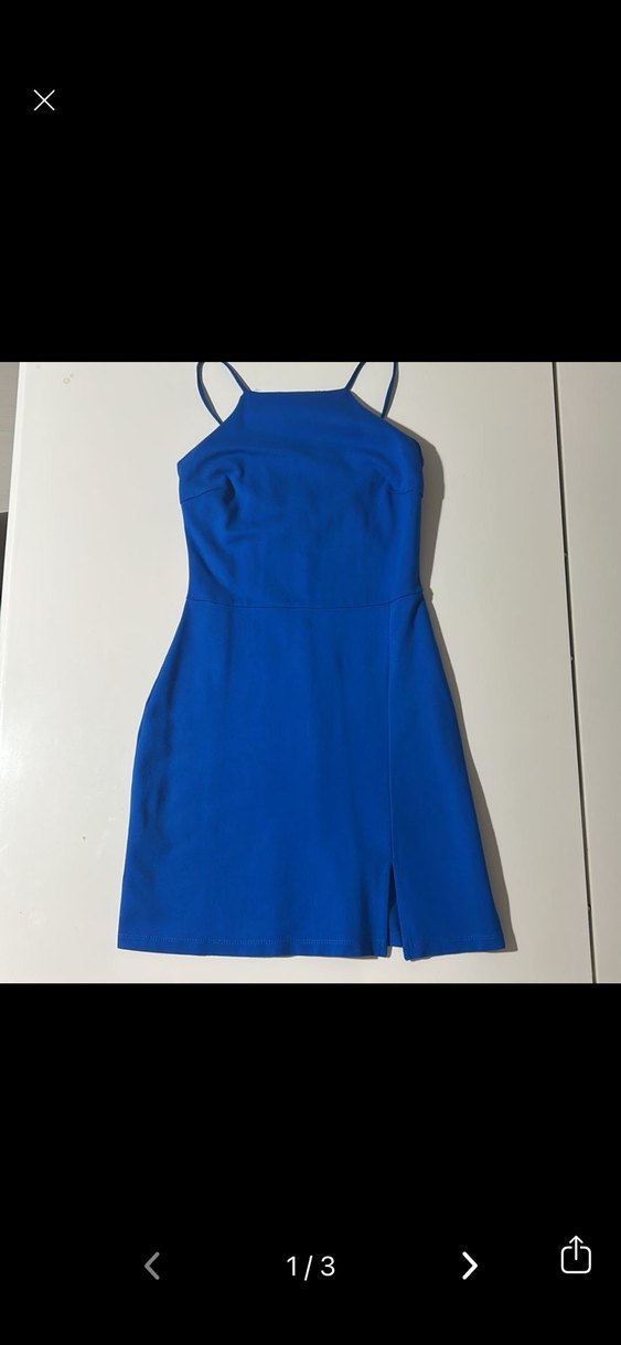Mavi, ince askılı ve yüksek yakalı, vücuda oturan midi elbise. Sentetik kumaştan parlak görünümlü, küçük yırtmaçlı, sade ve şık. Romantik akşamlar için uygun.