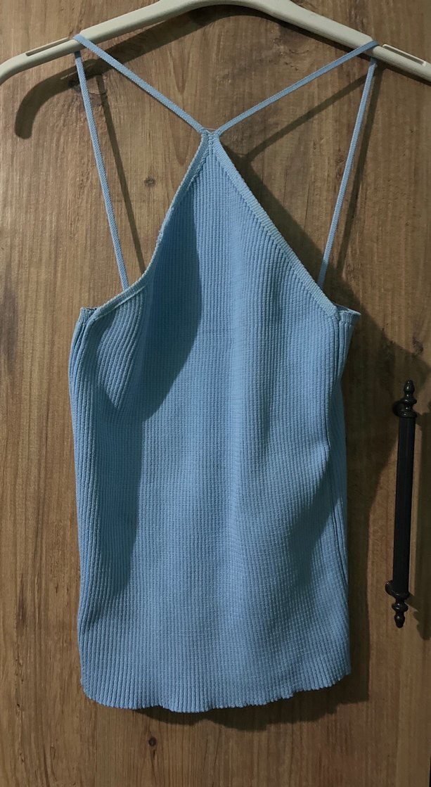 Pastel mavi renkte, ince askılı ve yüksek yakalı, triko dokulu, vücuda oturan normal midi uzunlukta minimal desensiz atlet.