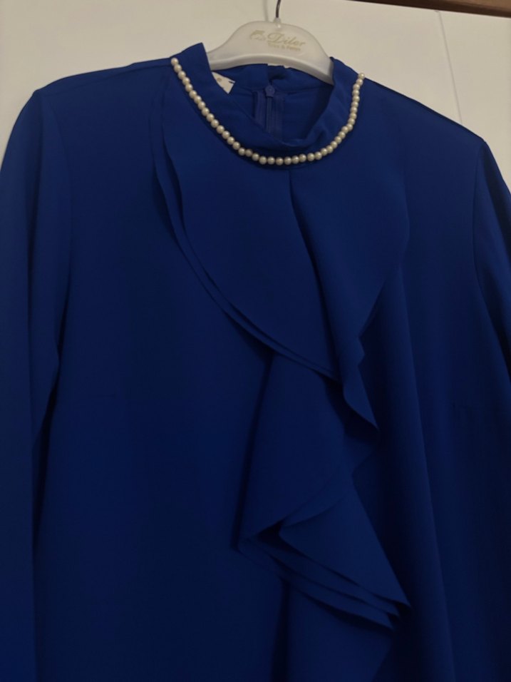 Mavi inci yakası ve kolları volanlı tunik