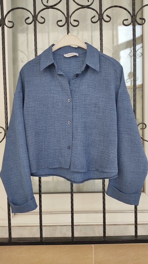 Düğmeli, keten kumaştan, uzun kollu, mavi renkli, normal midi boyda, rahat kesim kadın gömleği.sorunsuz yeni