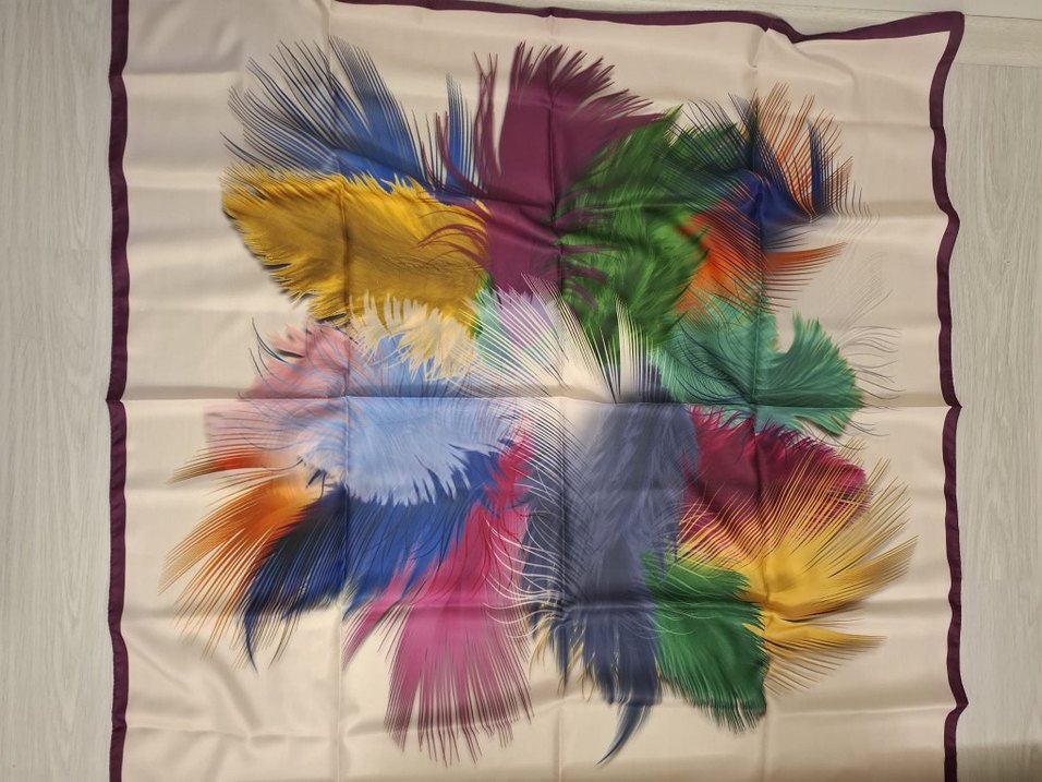 Kadınlar için ipek dokulu, canlı renklerde tüy desenli, Bayan eşarp . Hiç kullanılmadı, indirim yapılır.Sivas dışı satış yapmıyorum