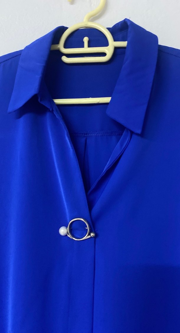 Kadın bluz, gömlek yaka ve düğmeli öne sahiptir. İpek dokulu, parlak mavi renkli, midi boy ve kısa kolludur. Rahat kesim, minimalist normcore tarzda, ofis için uygundur.