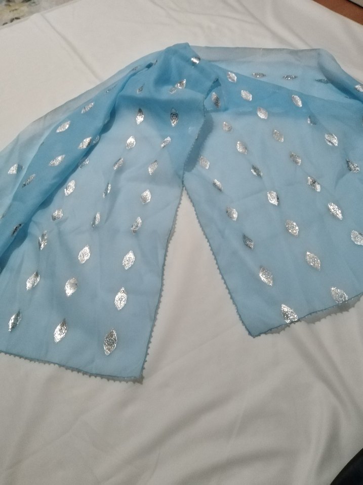 Mavi renkli, ipek görünümlü şal, parlak gümüş boncuk detaylarıyla dikkat çeker. Hafif yapısı bohem ve retro tarzlarla uyumludur. Kenarları iğne oyası şifon mevlid örtüsü