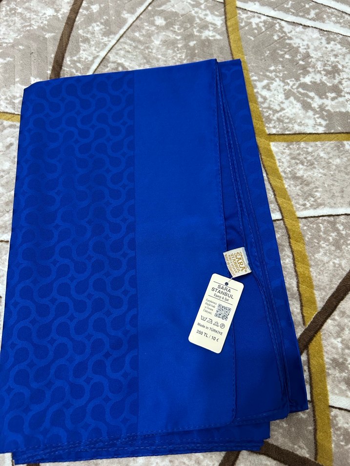 Kadınlar için parlak mavi, ipek görünümlü kumaştan, drapeli, iş ortamına uygun mütevazı ve klasik tarzda şal.