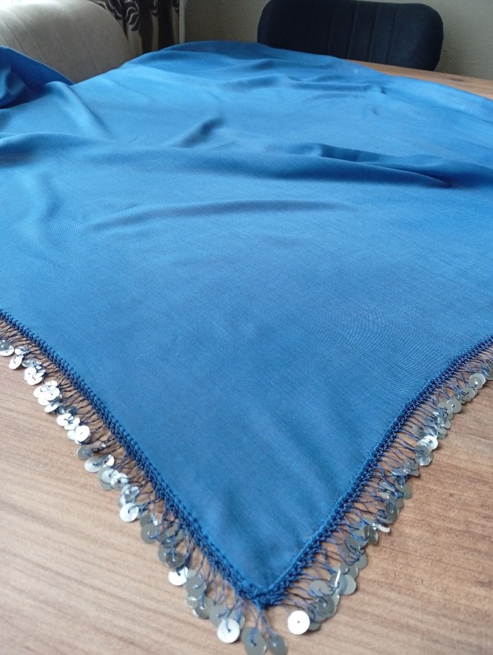 Mavi, parlak ve ipeksi dokusuyla, kenarları pullarla süslenmiş kadın fuları. Bohem ve retro tarzlara uygundur.
