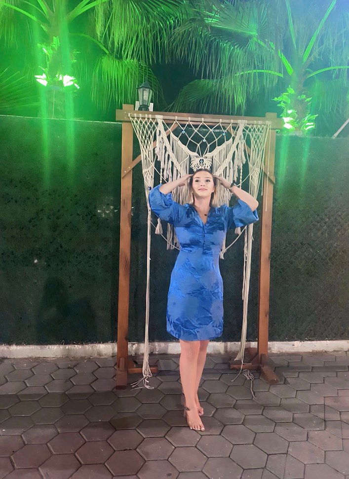 Parlak mavi tie-dye desenli, ipeksi kumaştan, drapeli ve halter yakalı bohem tarzda fitted midi elbise, parti için uygun.
