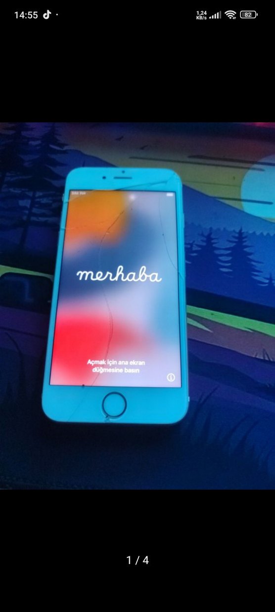 Çatlak ekranlı mavi iPhone, ekranda "merhaba" yazısı görülüyor.