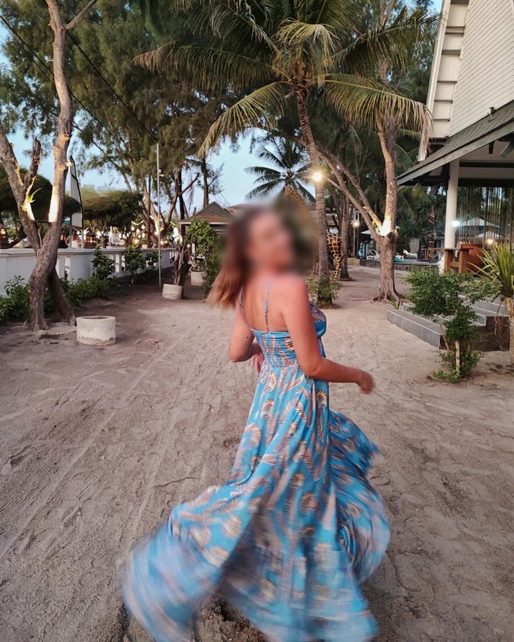 Mavi, pastel tonlarda batik desenli, ipli askılı, uzun ve bol kesim bohem elbise. İpek gibi dokusu ve drapeli tasarımıyla plaj için uygundur.