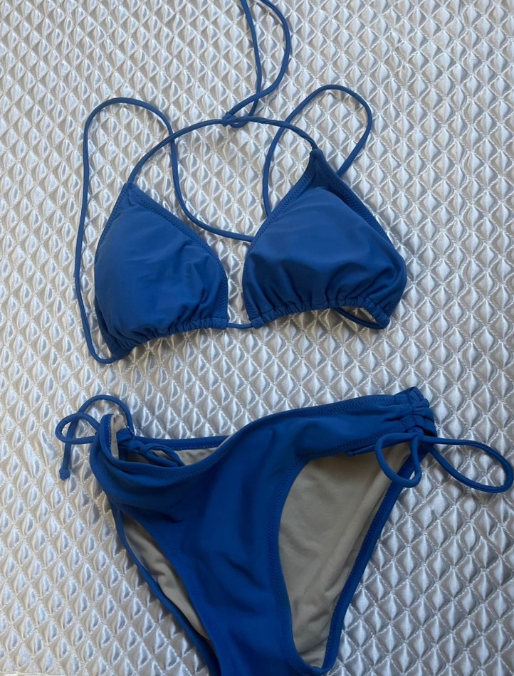 Mavi renkli, ipli askılı ve vücuda oturan modern kesim kadın bikini takımıdır. Plajda şıklık sunar, normal boyda ve rahat bir yapıya sahiptir.