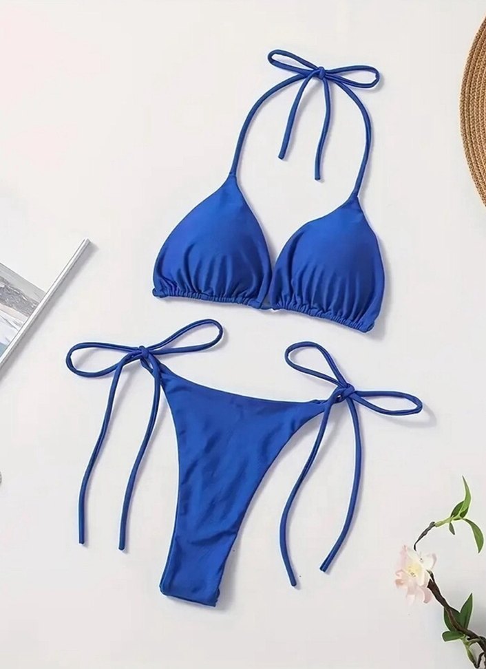 Mavi renkte, ipli askılı ve vücuda oturan kadın bikini takımı. Minimalist ve renkli tasarımıyla plajda rahat ve şık kullanım sunar. Daha fazla ürün için profilimizi ziyaret edebilirsiniz. ✨Ertesi gün kargo✨