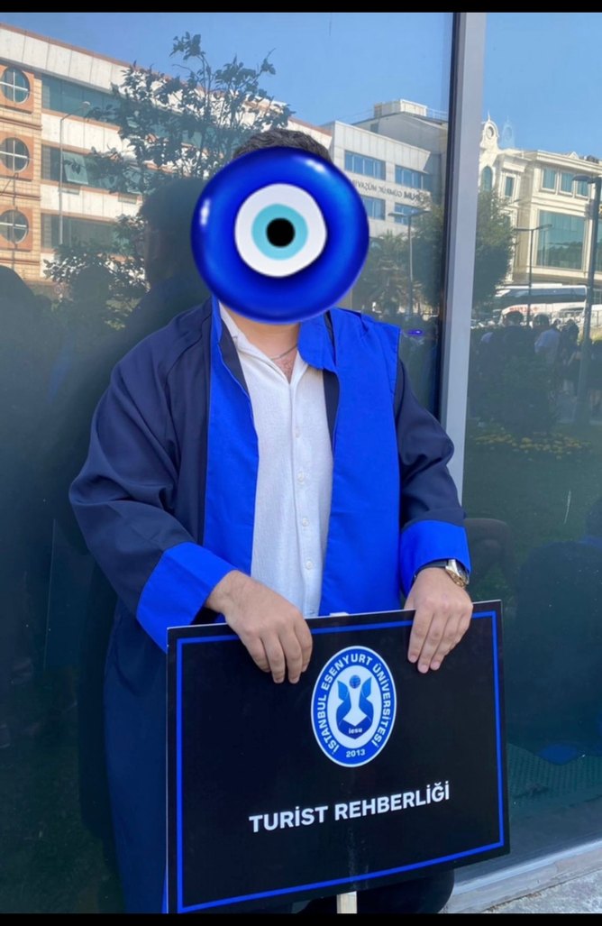 Parlak mavi renkte, mezuniyet için rozeti ve uyumlu cüppe. Üzerinde "TURiST REHBERLiGI" yazısı bulunur.