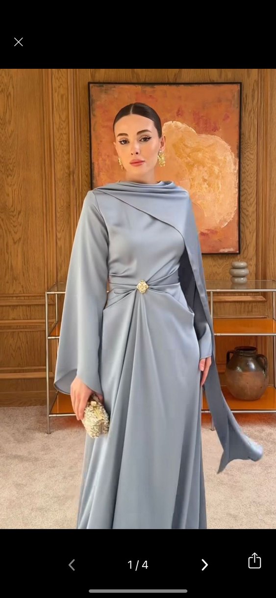 Kadınlar için gri renkte, drapeli ve uzun kollu, tek renkli abiye elbise. Uzun boy, tekne yakalı ve klasik şıklıkta, düğünlere uygun modern klasik tarzda.