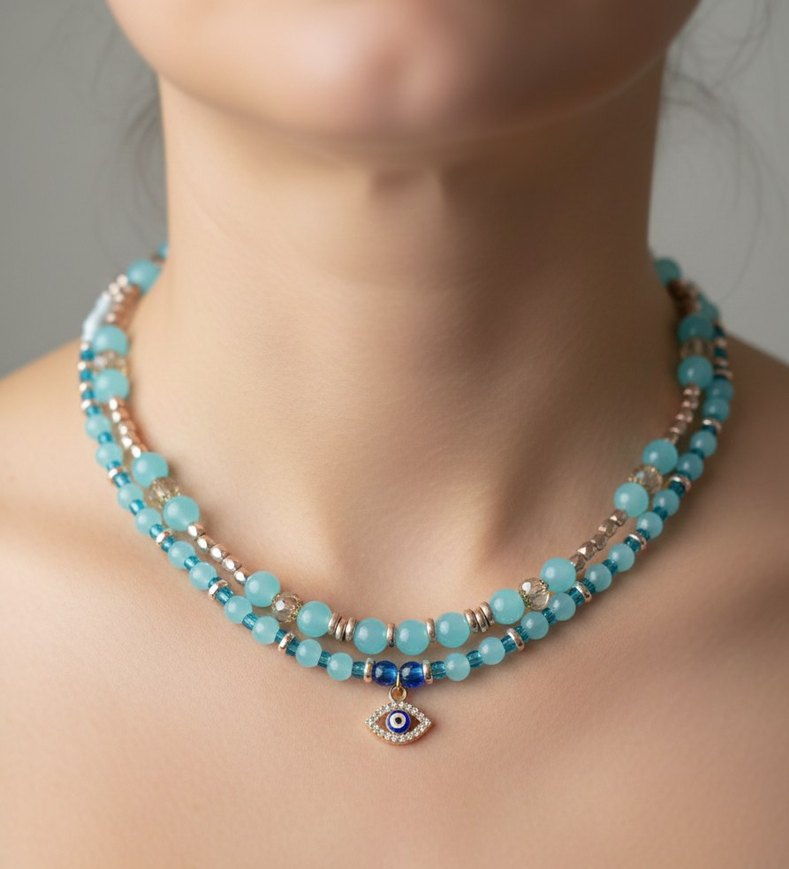 Nakış detaylı, küçük göz figürlü kısa turkuaz boncuklu kolye, bohem tarzı yansıtır, günlük kullanıma uygundur.