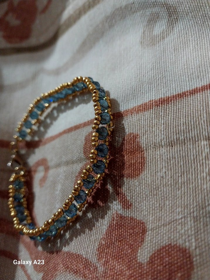 Açık mavi boncuklu bileklik, işlemeli detaylarla vintage bohem tarzını yansıtıyor. Zarif bir tasarım.