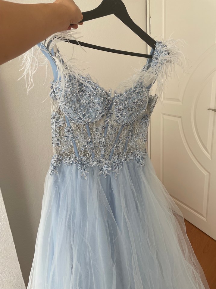 Pastel mavi, straplez nişan elbisesi işlemeli ve boncuklu dar kesim üst kısmıyla dikkat çeker. Kolsuz, omuzlarda tüy detaylı ve uzun etekli bohem ve gösterişli tarzı birleştirir.