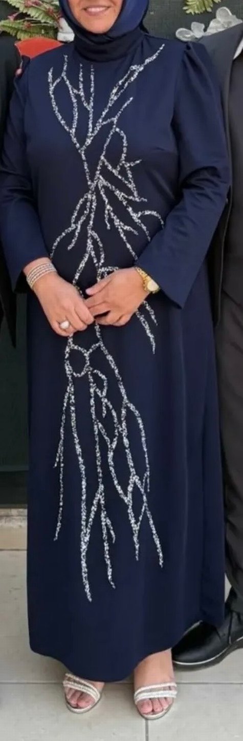 Mavi renkli, işlemeli ve boncuk detaylı, uzun ve vücuda oturan abiye elbisedir. V yaka ve uzun kolludur, düğünler için uygundur.