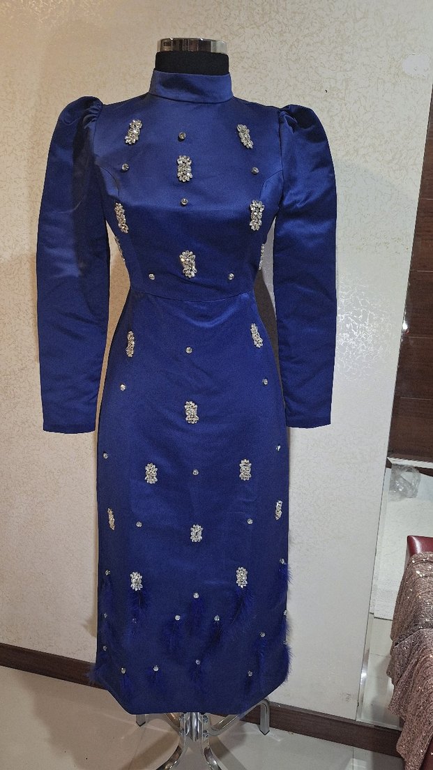SQTILIK Uzun mavi abiye elbise, yüksek yakalı ve uzun kollu, boncuk işlemeleriyle klasik zarafeti yansıtıyor. Düğünler için uygun.