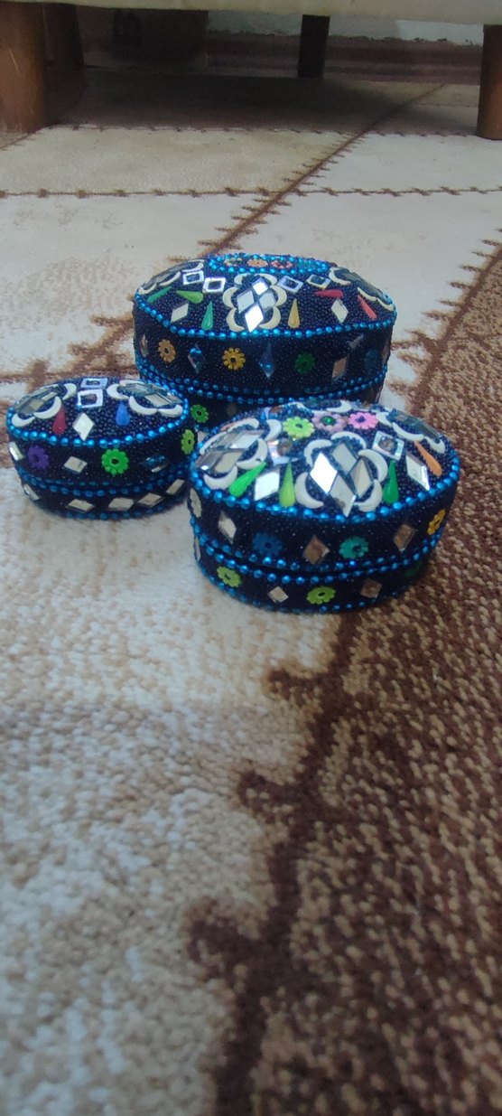 Ayna ve renkli boncuklarla süslenmiş mavi geleneksel el sanatları kutuları. Küçük eşyalar için uygun.