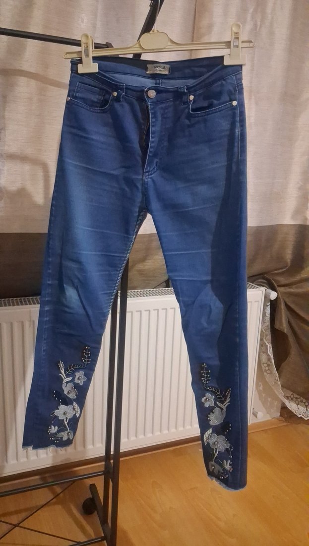 Mavi denim kumaştan, normal boyda ve rahat kesimli kadın pantolon. Bacaklarda işlemeli çiçek desenleri detayları bulunur. diz izi var başka biseyi yok günlük kullanıma uygun