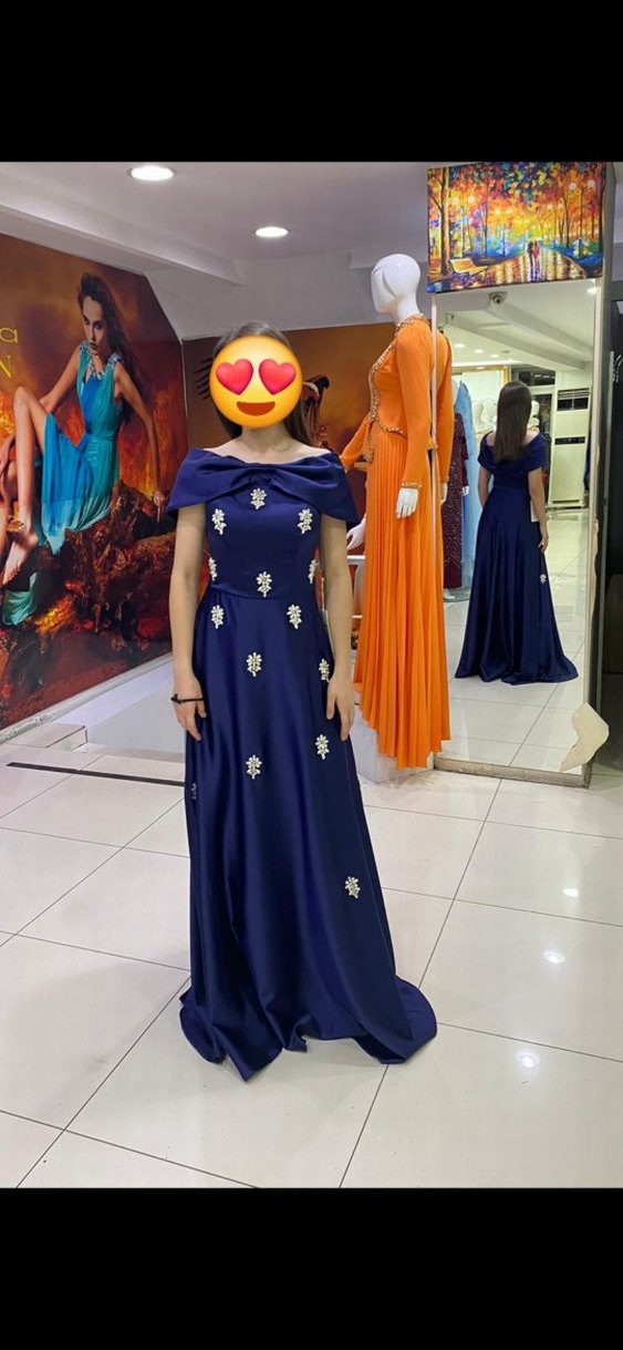 Ürün kullanılmadı hala etiketi üstündedir. kumaşı kaliteli ve satendir. Mavi uzun abiye, kayık yaka ve işlemeli detaylara sahiptir. Drapeli, regular fit ve kolsuz tasarımıyla şık bir görünüm sunar.