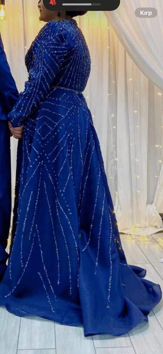 çok iyi durumda sadece nişanım için bir kere giyildi 2 türlü giyile bilir kuyruklu terzide kestirip bilek boy yapıla bilir avantajli bir abiye Mavi, işlemeli ve parlak desenlere sahip, bisiklet yakalı ve uzun kollu, sade kesimli uzun abiye elbise. Düğünler için uygun, şık ve mütevazı tasarım.