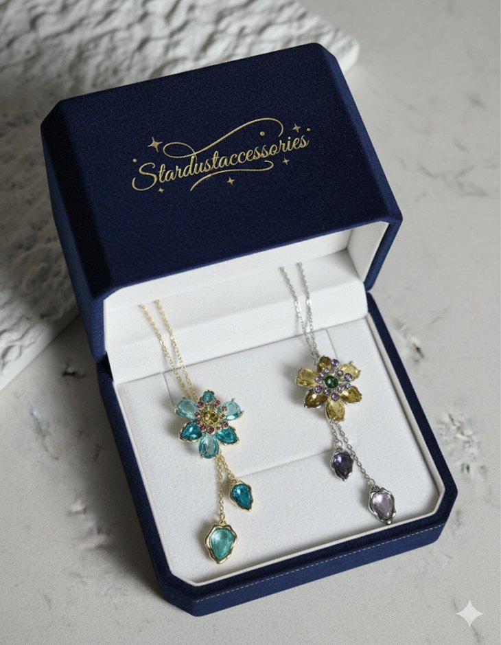 Mavi bohem tarzda, işlemeli çiçek desenli ve payet detaylı kolye. Normal uzunlukta midi sarkıtlı, düğünler için uygun. Marka: Stardustaccessories.