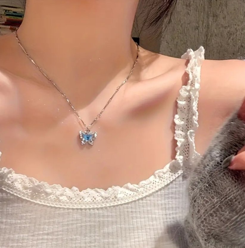 Mavi pul detaylı ve işlemeli kelebek figürlü midi uzunlukta kolye. Minimalist ve bohem tarzlara uygun, günlük kullanıma ideal.