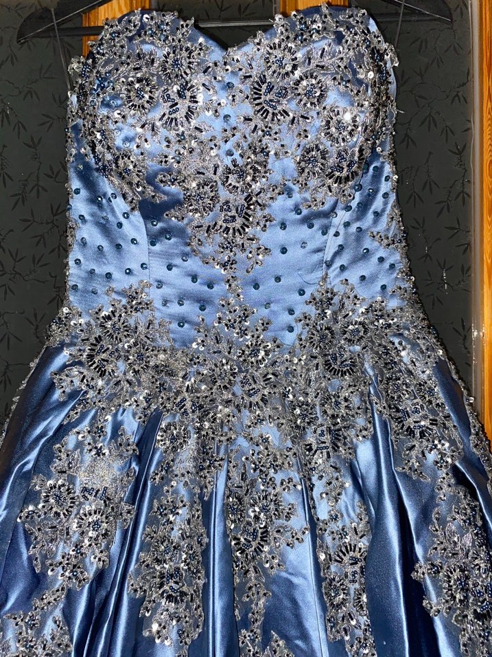 Taç ve küpesinide gönderebilirim Parlak mavi kumaş üzerine işlenmiş boncuk detaylı, straplez ve vücuda oturan bu uzun nişan elbisesi, gösterişli ve gotik tarzı bir araya getiriyor.